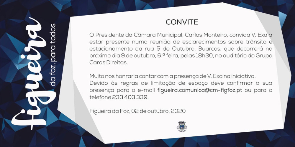 Reunião de esclarecimentos sobre trânsito e estacionamento da rua 5 de Outubro em Buarcos, que decorrerá no próximo dia 9 de outubro, 6ª feira, pelas 18h30, no auditório do Grupo Caras Direitas.