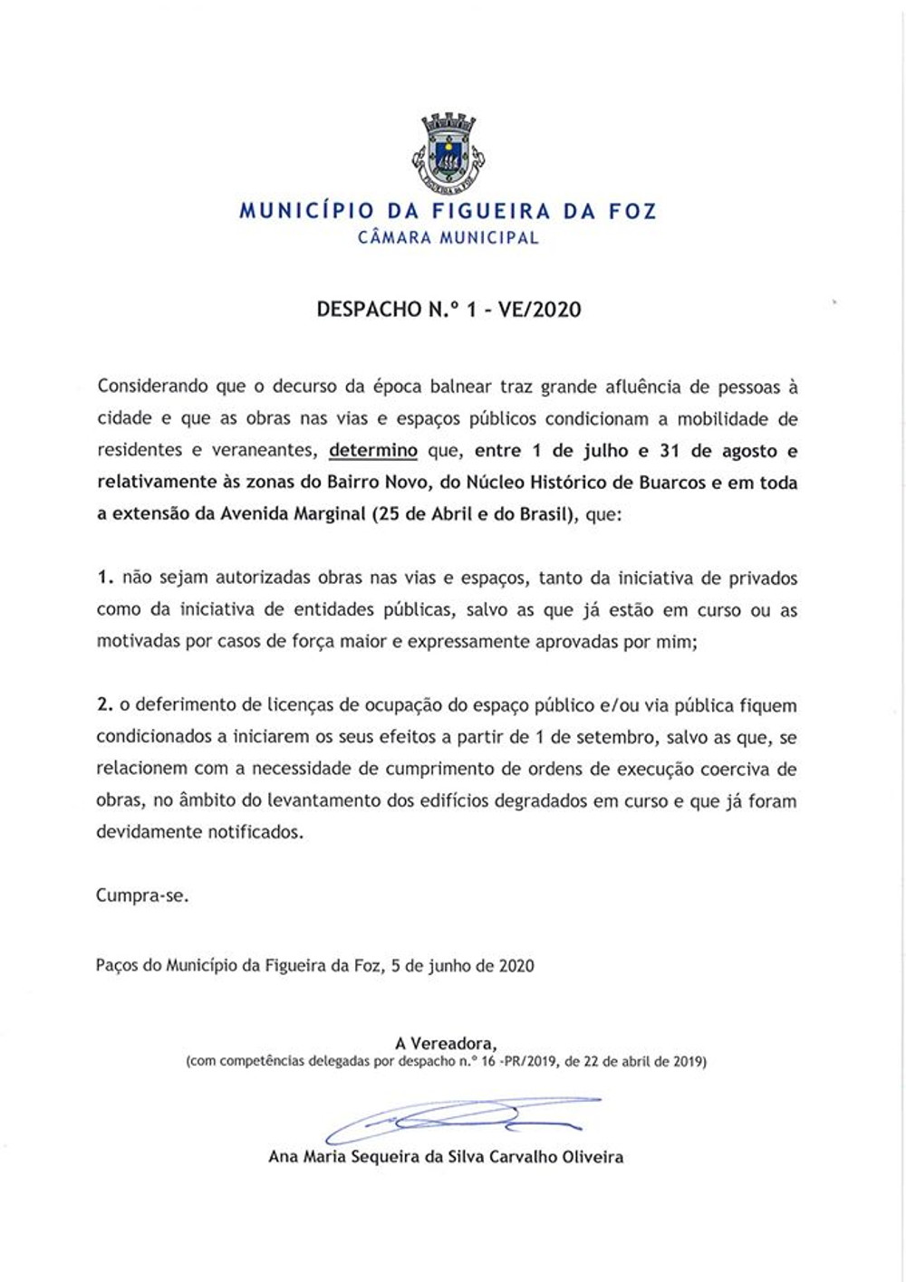 O Município da Figueira da Foz informa que, considerando que o decurso da época balnear traz grande afluência de pessoas à cidade e que as obras nas vias e espaços públicos condicionam a mobilidade de residentes e veraneantes, a vereadora Ana Carvalho determinou, por despacho nº1 -VE/2020, de 05 de junho, condicionar o deferimento de licenças para ocupação de espaço público e/ou via pública e não autorizar obras na via pública ou espaço público, de 01 de julho a 31 de agosto, no Bairro Novo, Núcleo Histórico de Buarcos e em toda a extensão da Avenida Marginal ( Av. 25 de Abril e Av. do Brasil).