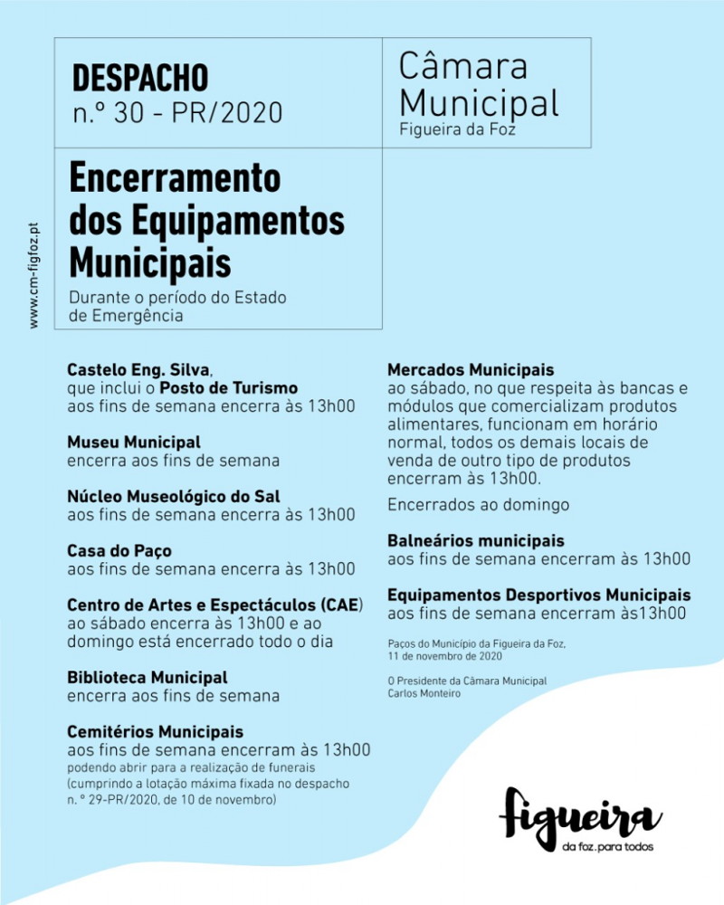 O Município da Figueira da Foz informa que, nos termos do artigo 3º do Decreto nº. 8/2020 e durante o período do Estado de Emergência e do despacho nº30-PR/ 2020, o presidente da Câmara Municipal, Carlos Monteiro, determinou implementar as seguintes medidas e horários nos Equipamentos Municipais.