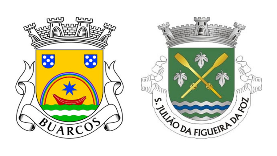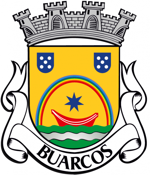 Armas - Escudo de ouro, arco-íris de suas cores (violeta, anil, azul, verde, amarelo, laranja e vermelho) movente de campanha diminuta ondada de verde e prata de três peças, com barco vogante de vermelho, realçado de prata, encimado por estrela de sete pontas de azul; em chefe, dois escudetes de azul, carregado cada um de cinco besantes de prata. Coroa mural de prata de quatro torres. Listel branco, com a legenda a negro: “ BUARCOS “.